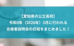 愛知県の高校入試 令和8年度入試【愛知県の公立高校】令和8年(2026年)3月に行われる合格者説明会の日程をまとめました! 令和8年(2026年)の公立高校の一般選抜の合格者発表は3月10日(火曜日)です。 合格者発表が終わると各高校で「合格者説明会」が行われますが、参加は原則として保護者同伴とされている高校がほとんどです。 (毎年、保護者の付き添い2025.11.122025.11.17愛知県の高校入試 令和8年度入試